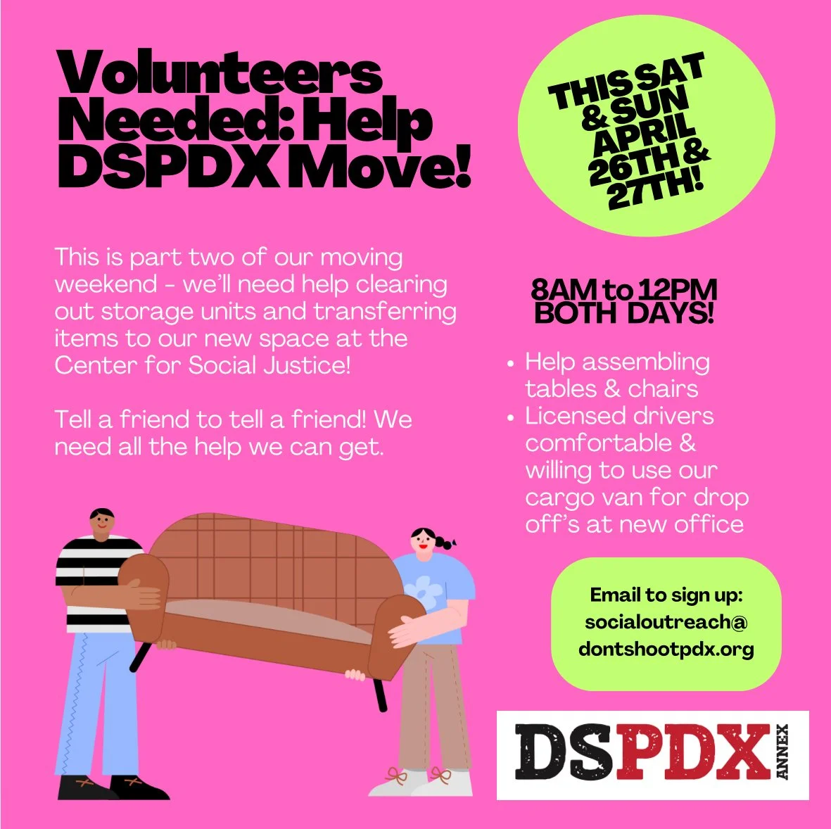 BLog Tai Carpenter 10/15/25 Tai Carpenter 10/15/25 DSPDX Fall Programming: Not Black Friday 2025 Read More Tai Carpenter 9/26/25 Tai Carpenter 9/26/25 Black Cultural Library Open House + Art Build and New Exhibit at The bLACK Gallery! Read More Tai Carpenter 8/5/25 Tai Carpenter 8/5/25 W O W ๐นThank you for voting us Best of Portland - last chance to register for Black August! Read More Tai Carpenter 7/22/25 Tai Carpenter 7/22/25 Black August 2025 Read More Tai Carpenter 7/19/25 Tai Carpenter 7/19/25 Community Unity Day & Food Forest Open House at Hughes! Read More Tai Carpenter 6/10/25 Tai Carpenter 6/10/25 ๐๐๐พ Juneteenth Week of Action: Join Us to Make Art + Build Resistance! Read More Tai Carpenter 6/1/25 Tai Carpenter 6/1/25 June 5th Is the Anniversary Of Our Successful Lawsuit to Protect the Right to Protest! ๐ชง Read More Tai Carpenter 5/7/25 Tai Carpenter 5/7/25 Help Don't Shoot Portland Build a Food Forest for A Historic Black Church! Read More Tai Carpenter 4/23/25 Tai Carpenter 4/23/25 Vote Us Best of Portland + Spring Updates โ๏ธ Read More Tai Carpenter 3/25/25 Tai Carpenter 3/25/25 Spring Break Out 2025! Read More Tai Carpenter 3/1/25 Tai Carpenter 3/1/25 Donโt Shoot Portland at SXSW in Austin, TX: March 7-March 15th! Read More Tai Carpenter 2/8/25 Tai Carpenter 2/8/25 What to do after a loved one is taken by ice [know your rights info guide] Read More Tai Carpenter 2/4/25 Tai Carpenter 2/4/25 BLACK FUTURES FORWARD: Come See Us at The Black, Black History Museum! Read More Tai Carpenter 1/17/25 Tai Carpenter 1/17/25 Reclaim MLK 2025! Read More Tai Carpenter 12/3/24 Tai Carpenter 12/3/24 Please support us today on Giving Tuesday! Read More Tai Carpenter 11/24/24 Tai Carpenter 11/24/24 On November 29 Black Lives Matter Not Black Friday, will kick off our organizing for Reclaim MLK 2025! #BoycottBlackFriday Read More Tai Carpenter 10/25/24 Tai Carpenter 10/25/24 Art build tomorrow & election watch party/opening reception! Read More Tai Carpenter 10/1/24 Tai Carpenter 10/1/24 October First Thursday: Fall Artist Talk & Closing Reception at The BLACK Gallery powered by DSPDX! Read More Tai Carpenter 9/3/24 Tai Carpenter 9/3/24 ๐ฃ Weโre presenting alongside our UO cohorts at the Oregon Museums Association in September! Read More Tai Carpenter 8/1/24 Tai Carpenter 8/1/24 Black August in reflection of a decade of Don't Shoot PDX, a Community Action Plan Read More Older Posts
