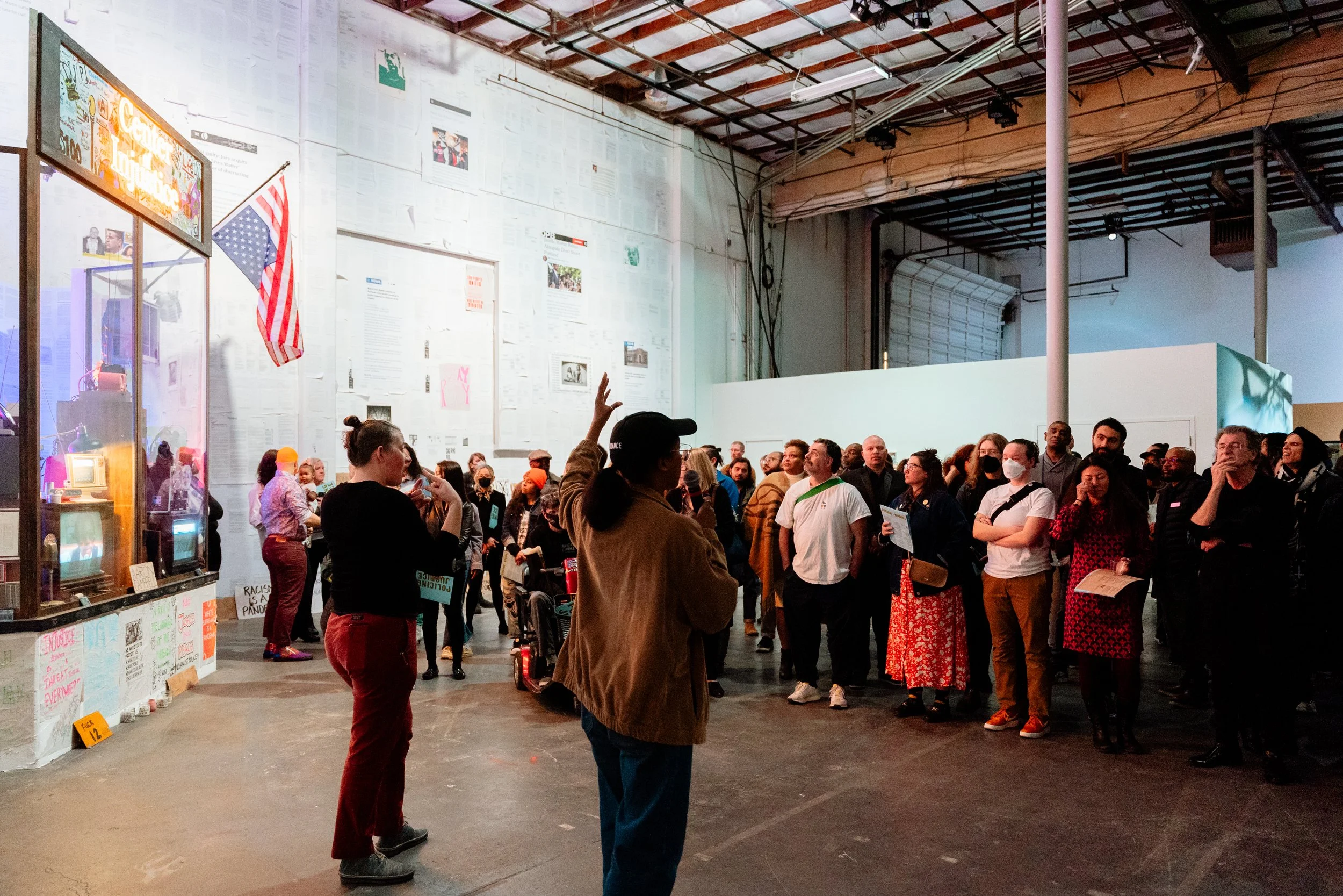 The Center of Injustice, 2024 is a mixed media installation by Don’t Shoot Portland and Media Pollution which presents historic evidence of police violence and political retaliation against local Black activist communities in Portland. The installation bridges past and present, from the KKK’s close ties with the police and city government in the 1920s, to police intimidation and attacks on Black businesses in the 1980s, to individual testimonies and resistance footage from activists today. Commissioned for the Policing Justice exhibit at Portland Institute of Contemporary Art (PICA), the installation was active from February to May 2024.
